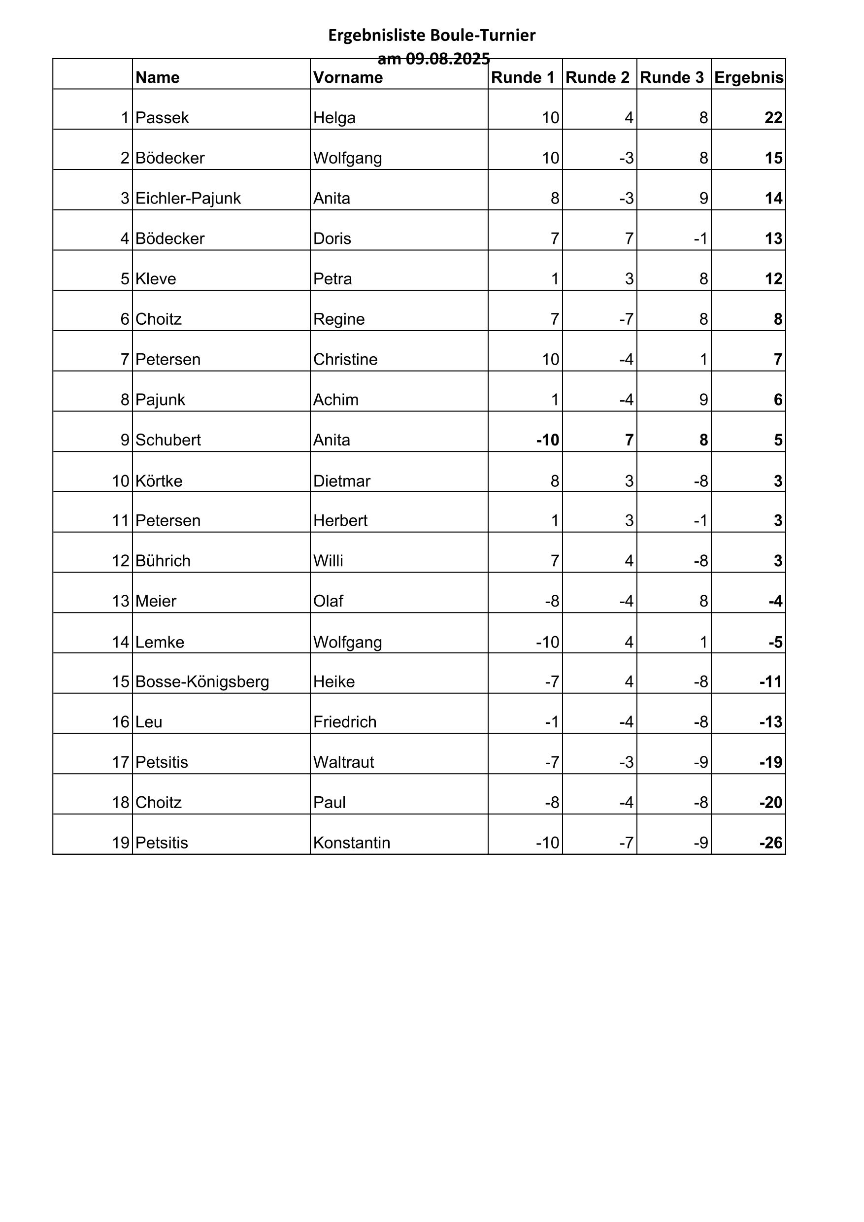 Am 09.08.fand unser Boule-Spass-Turnier für Senioren ü60 statt, an dem insgesamt 19 begeisterte Teilnehmerinnen und Teilnehmer teilnahmen. Das Event war ein voller Erfolg und sorgte für viel Freude und gesellige Stunden.