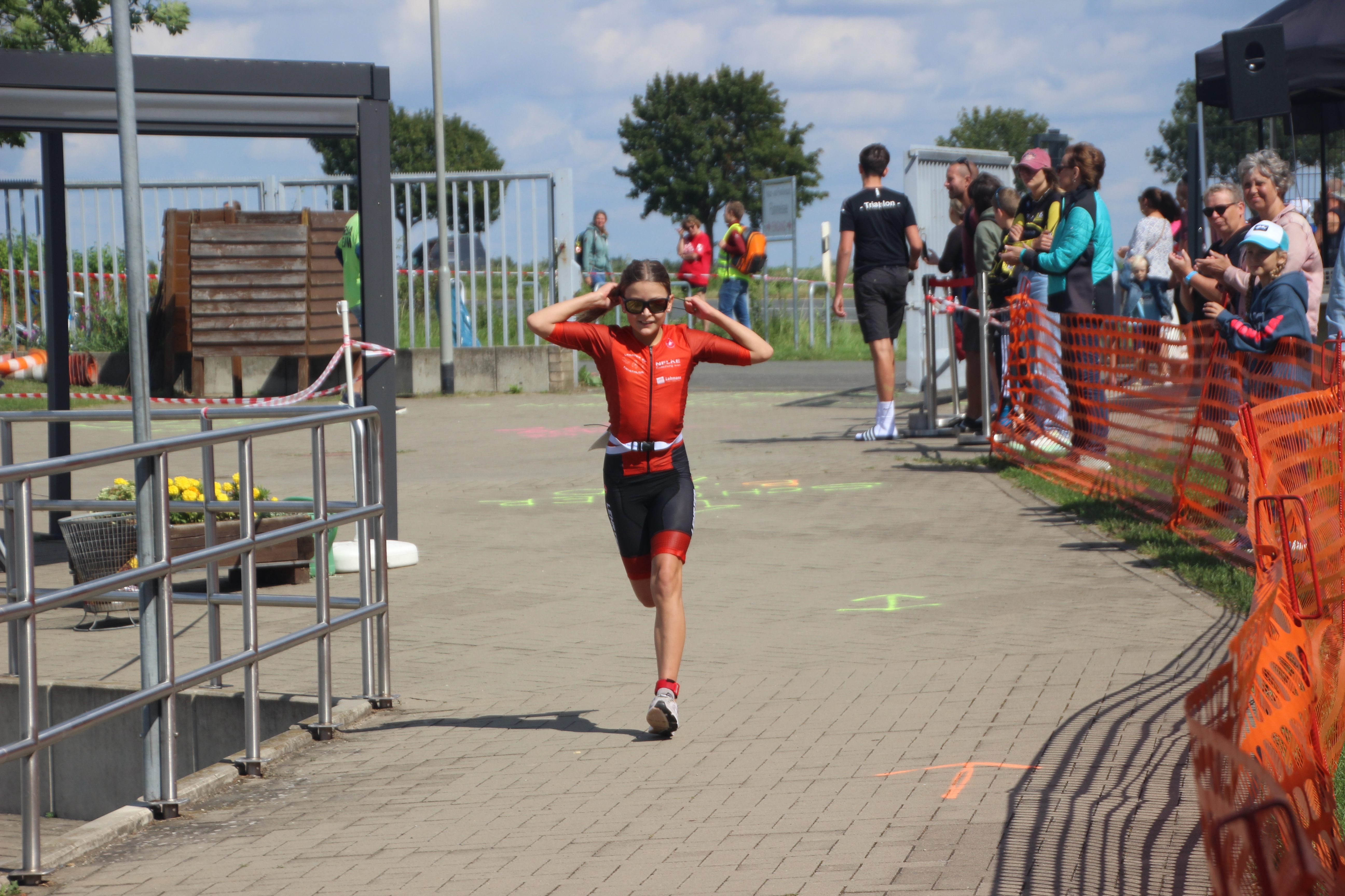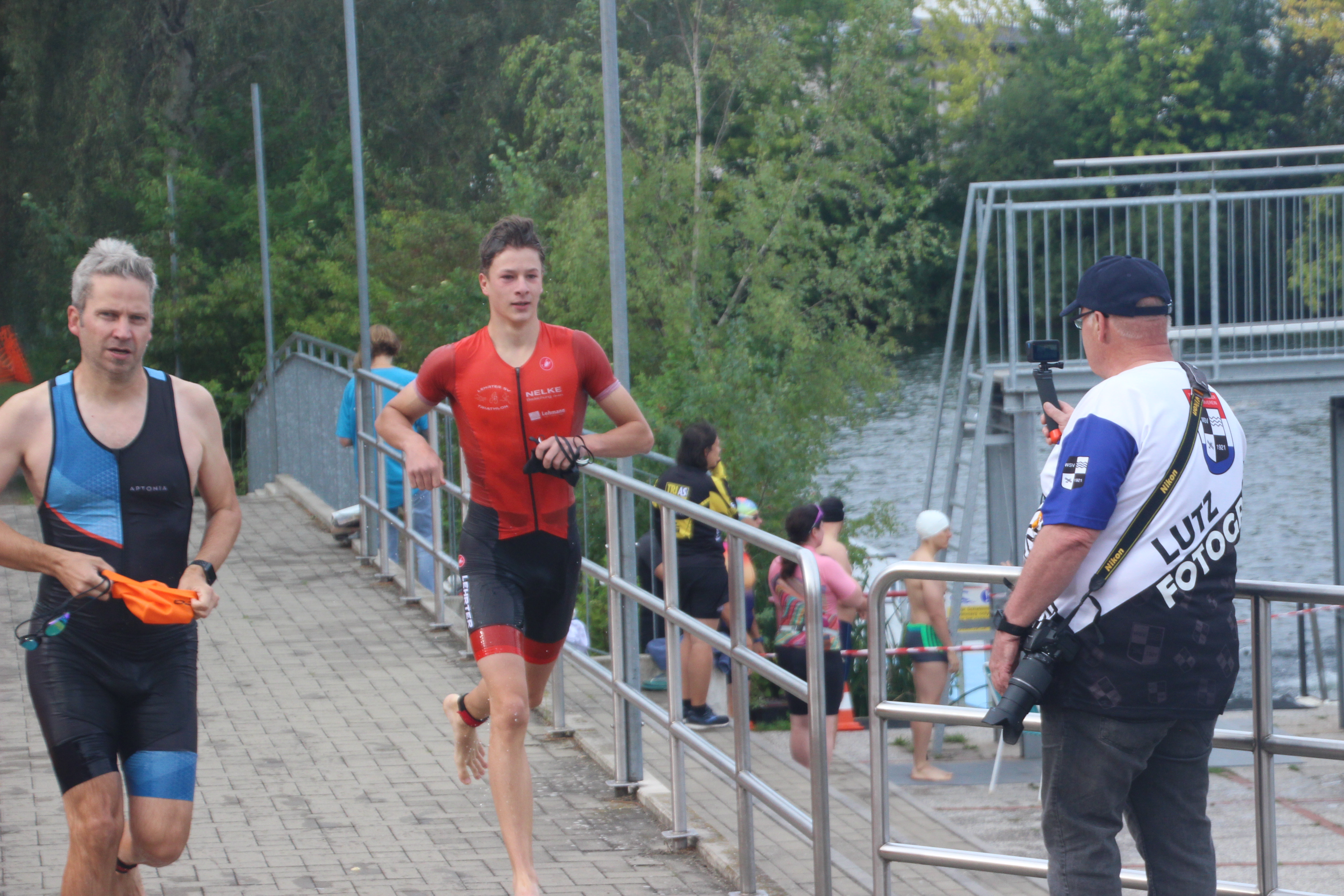 Mit einem ständigen hin und her der Startzeit, ging es dann für die Schüler A und Jugend B um 12:15 mit einem Massenstart ins Rennen. Greta kam an dritter Stelle aus dem Wasser und lag bis dahin gut im Rennen. Leider wurden die ersten zehn Starter auf der Radstrecke falsch geleitet und fuhren anstatt auf den Wendepunktkurs auf den Rundkurs des Volkstriathlons. Nach einiger Zeit konnten die meisten Sportler den Weg zurück zur Wettkampfstrecke finden, die Verwirrung war ihnen im Gesicht jedoch sehr anzusehen. Nach mehr oder weniger 10 Kilometern auf dem Rad ging es dann auf die Laufstrecke. Nach dem Wettkampf entschied das Kampfgericht, der Fairness halber, die Radzeit rauszunehmen und die Wertung als Swim and Run durchzuführen. Dabei konnte sich Greta einen großartigen zweiten Platz in der weiblichen Jugend B erkämpfen, Carla siegte erneut in der Schülerinnen A Wertung. Frieda konnte einen 4. Platz erlaufen, Oscar landete auf Platz 8.